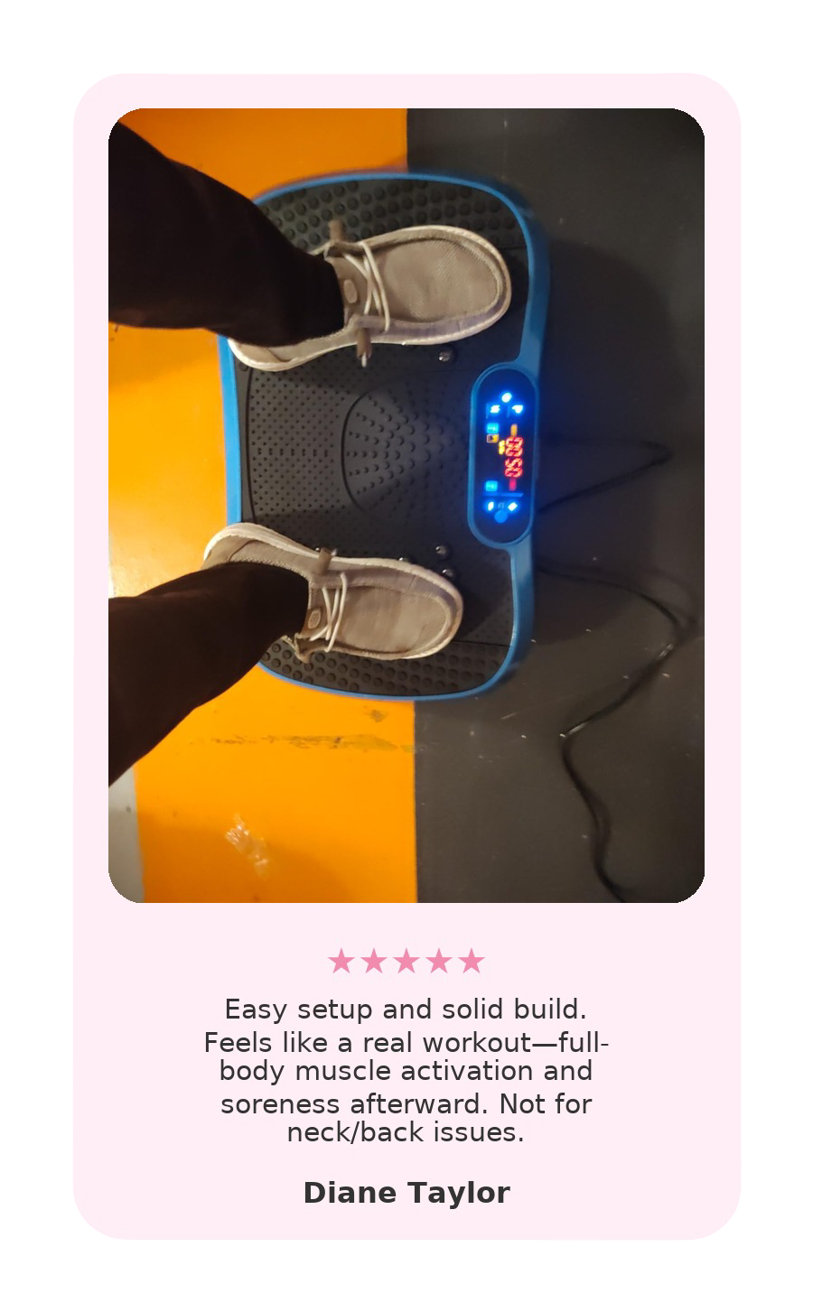Safety: Not a medical device. Consult a doctor if pregnant or have bone, joint, heart issues, or implants. Use on a flat, stable, dry surface indoors. Stop if dizzy or in pain. Keep children and pets away. Don't use if damaged.